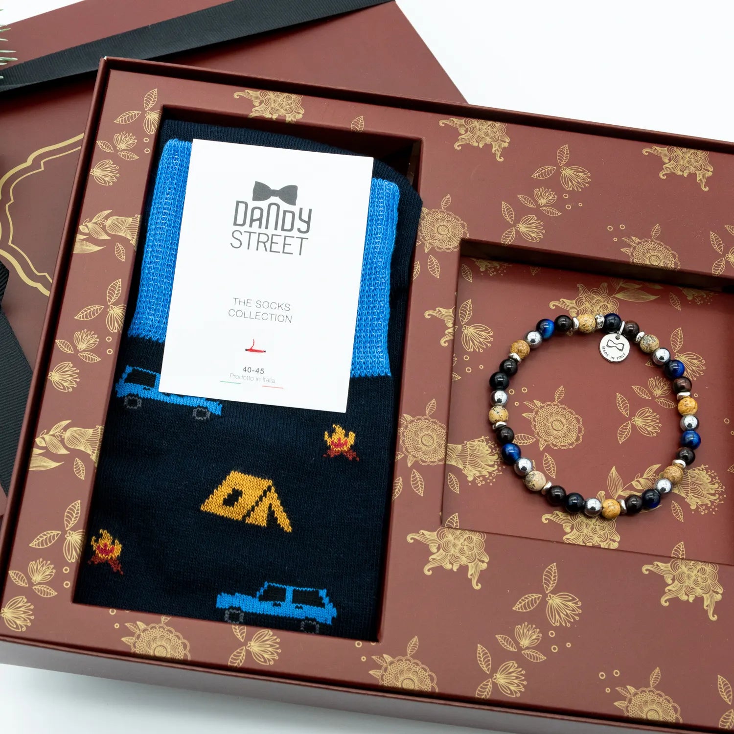 Dai voce al tuo amore durante le festività con la nostra esclusiva box da uomo, il regalo ideale per un Natale indimenticabile: all'interno troverai un sofisticato bracciale con pietre naturali, abbinato a calze artigianali italiane in cotone pregiato. La confezione, elegante e raffinata, rende questo set un dono di classe adatto a tutte le occasioni. Questa accattivante combinazione darà un tocco di stile e originalità a ogni look e farà esprimere la personalità di chi lo indossa in modo distintivo.