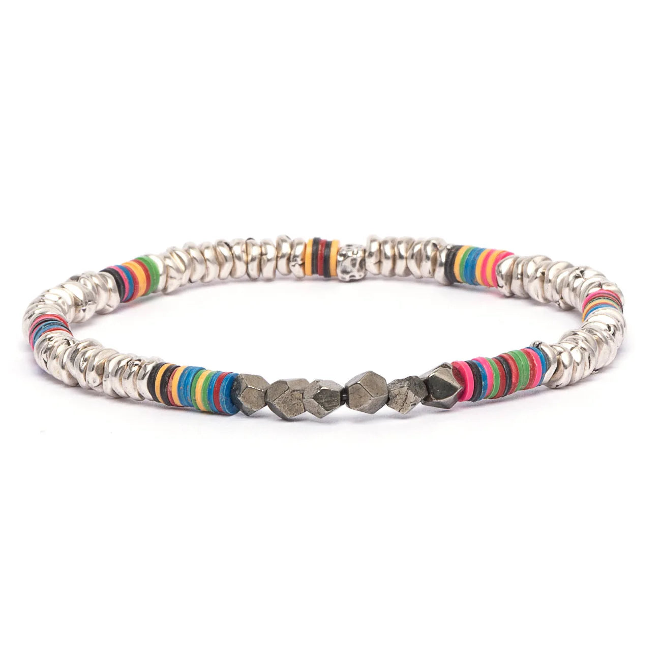 Arcus è un bracciale da uomo elastico realizzato a mano con pietre naturali di pirite e vinile africano di dimensione 4mm. Le minuterie di questo bracciale maschile sono placcate argento 5 micron.