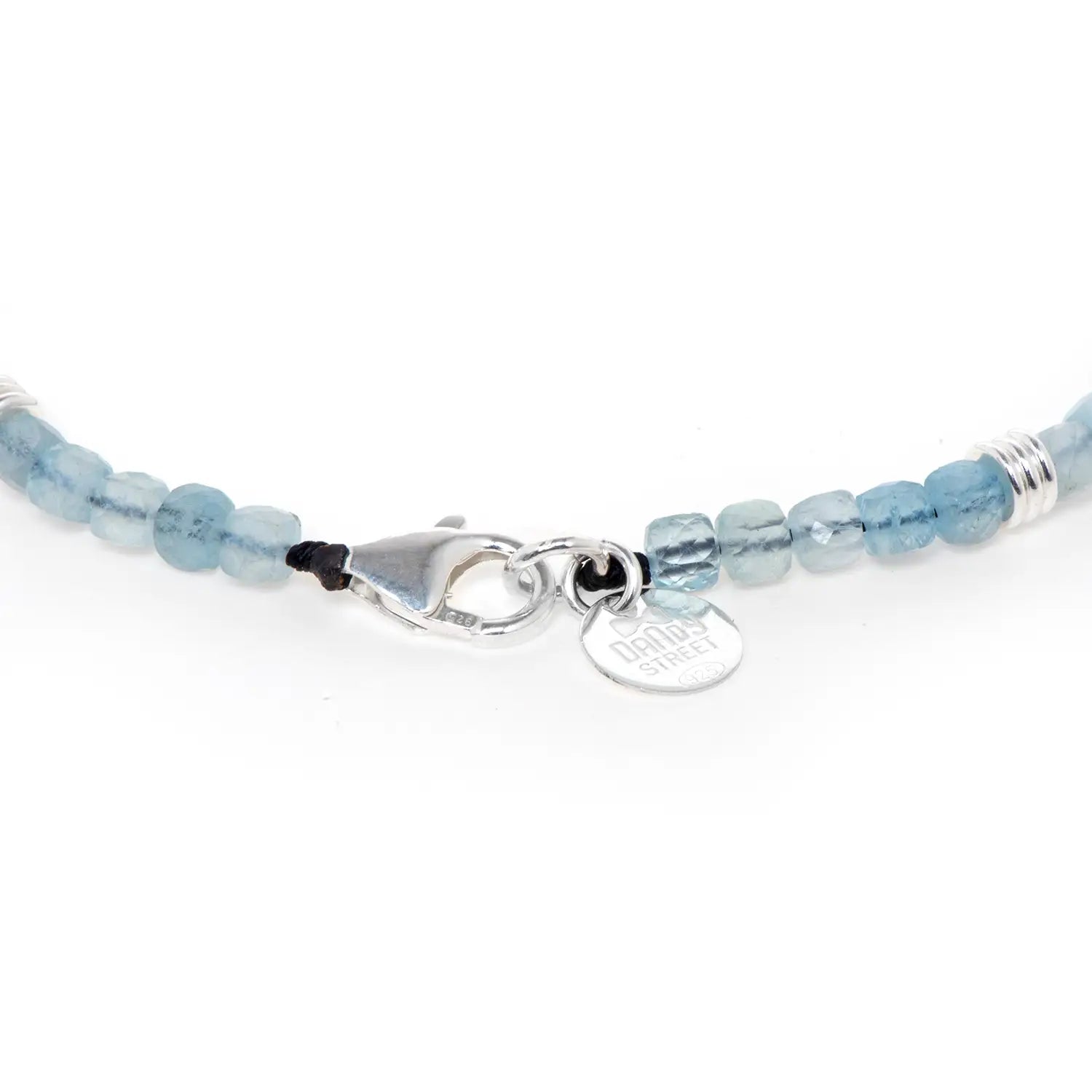 Acqua è un bracciale da uomo con pietre naturali di acquamarina realizzato a mano in Italia, un accessorio delicato e sofisticato che cattura lo sguardo con la sua freschezza elegante.