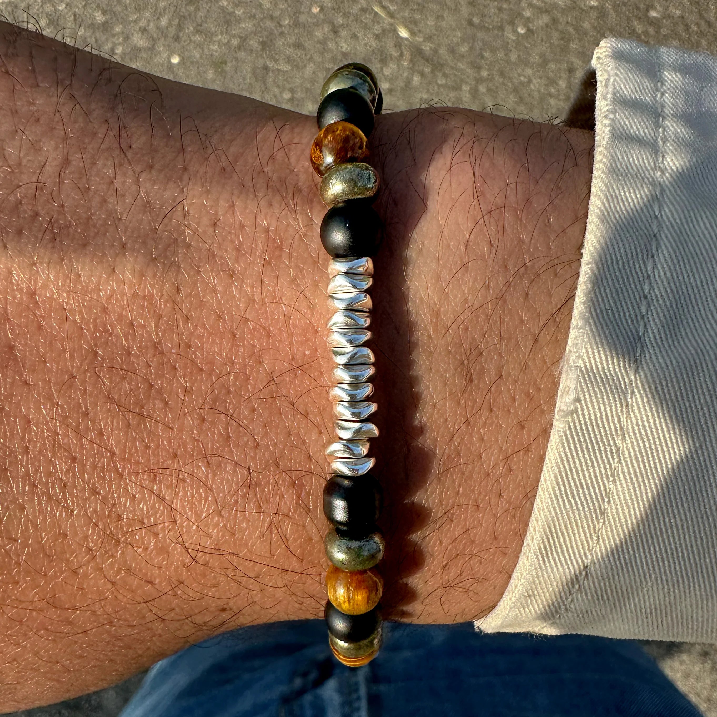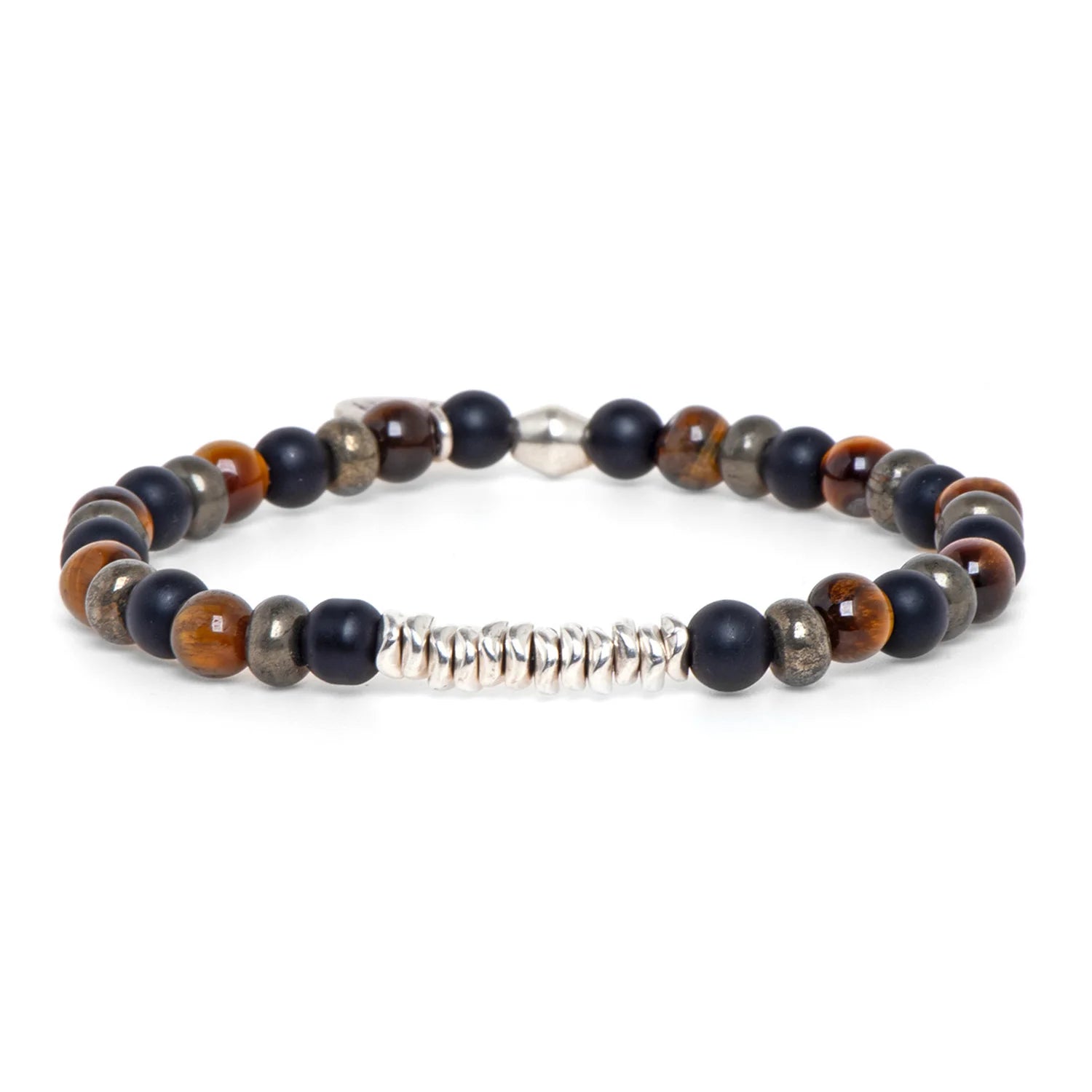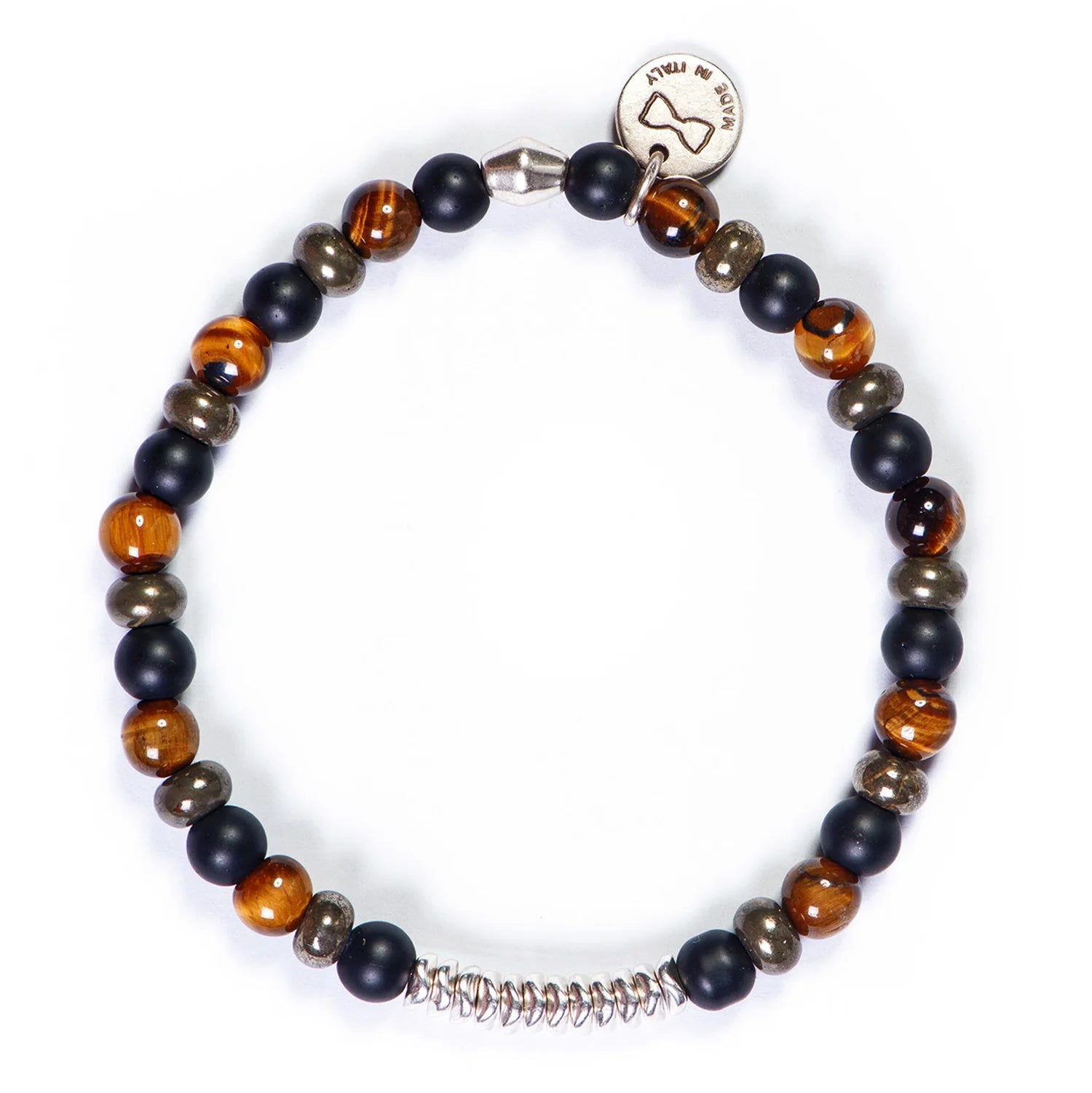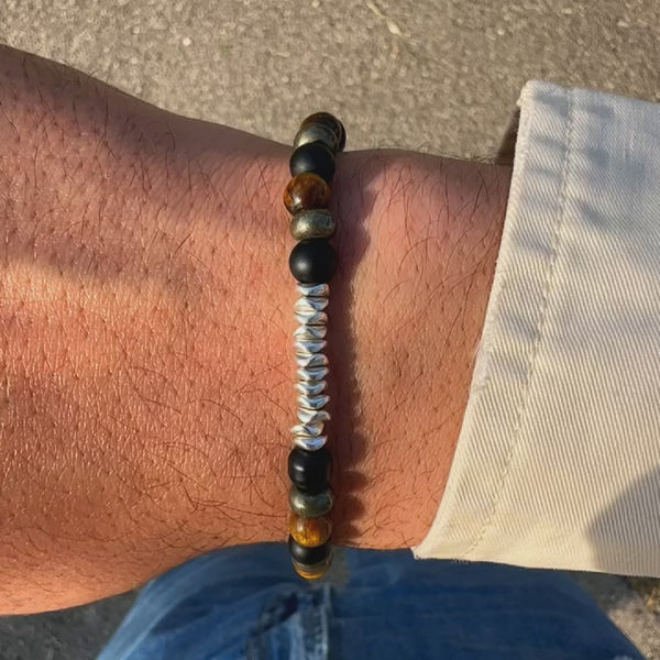 Bracciale da uomo dal design elegante con pietre di occhio di tigre, pirite e onice, un accessorio che esprime forza e carattere attraverso un design armonico