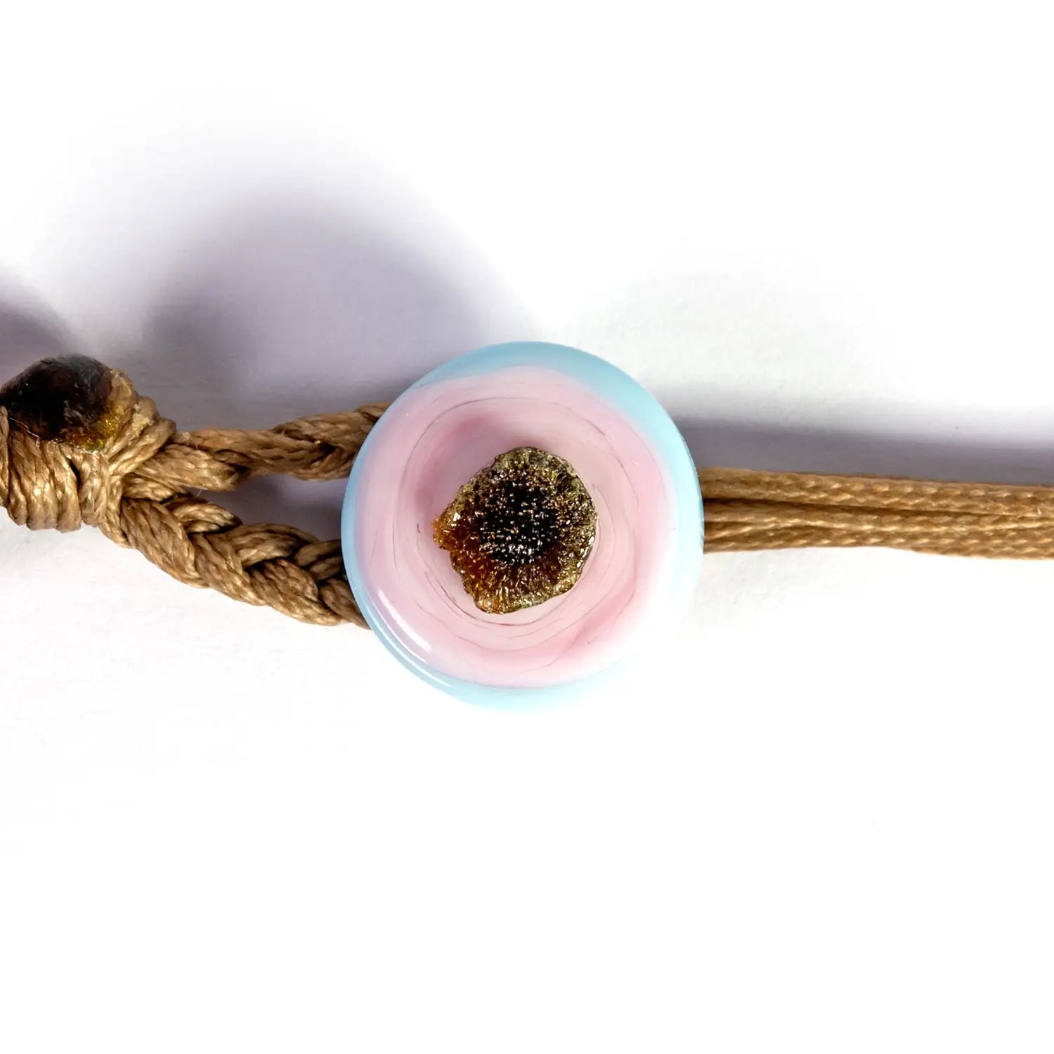 - Materiali: Luminose Murrine in vetro di Murano di color rosa da 10 mm, minuterie in argento 925, cordino cerato di color marrone con lavorazione a nodini;