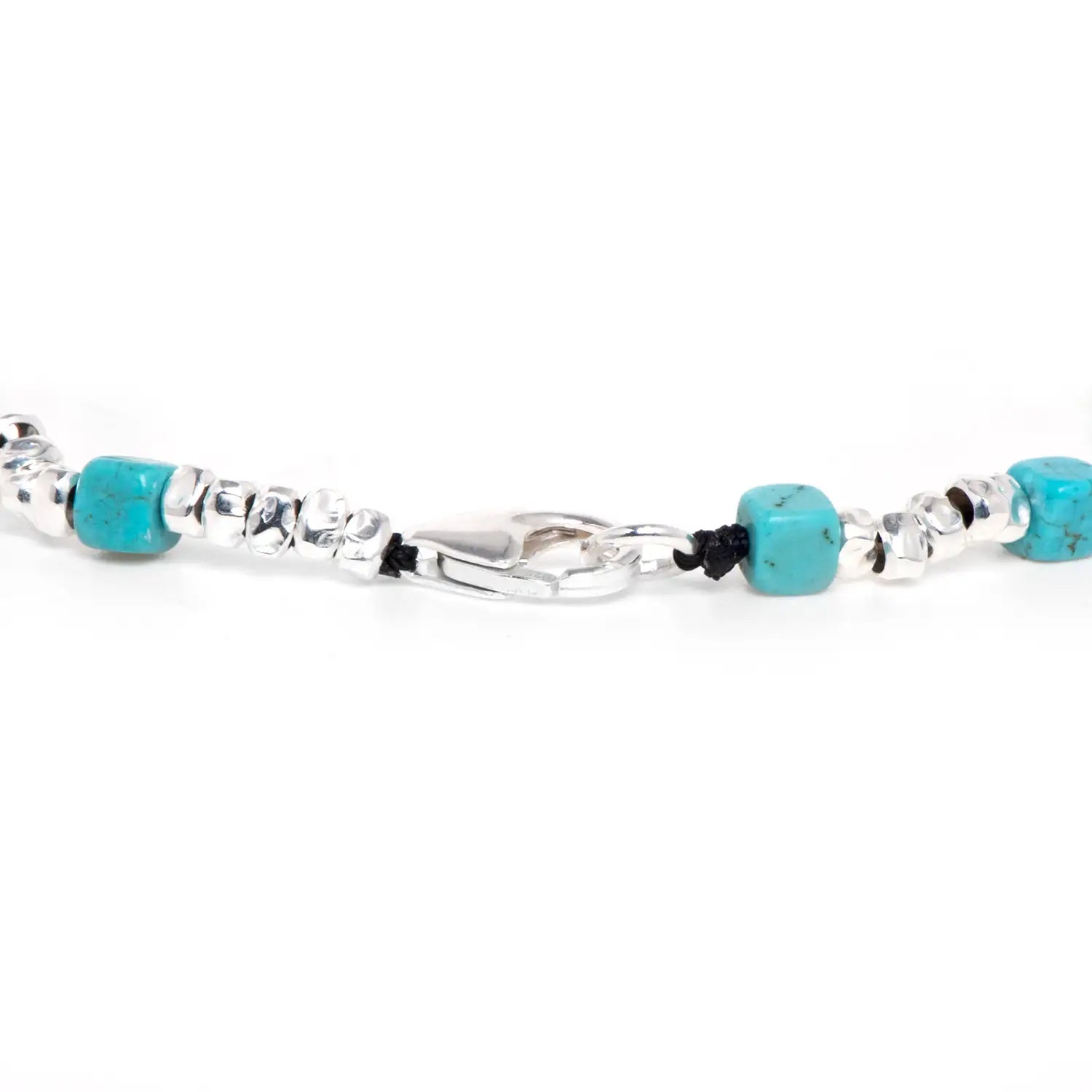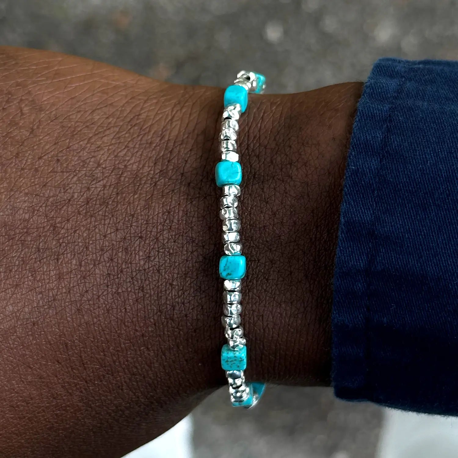 Realizzato con pietre di aulite dalle tonalità turchesi e impreziosito da elementi in argento 925, questo bracciale si distingue per il suo equilibrio perfetto tra colore e luce. Le forme geometriche delle pietre si alternano ai riflessi argentati con ritmo dinamico, dando vita a un design moderno e leggero.