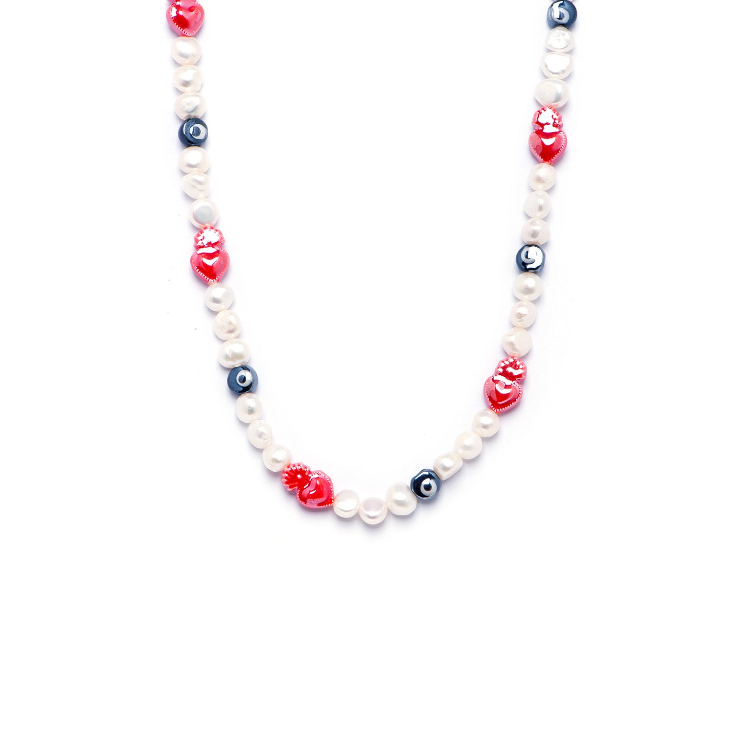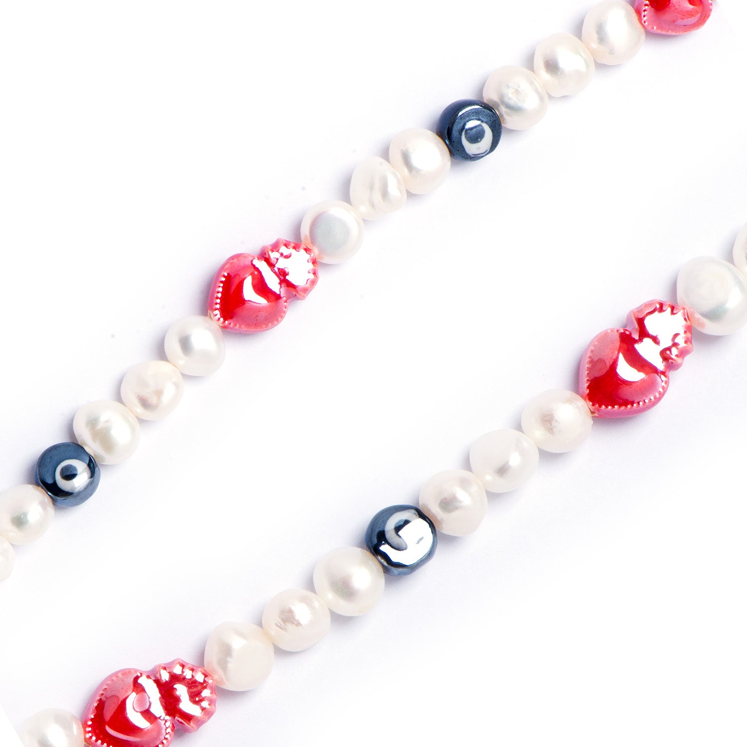 Composta da perle di fiume, cuori rossi in ceramica e dettagli con occhio greco, questa collana unisce tradizione, significato e stile in un design fresco e sorprendente. Il contrasto tra le perle naturali e i colori accesi crea un ritmo visivo dinamico, ideale per aggiungere originalità a ogni outfit.